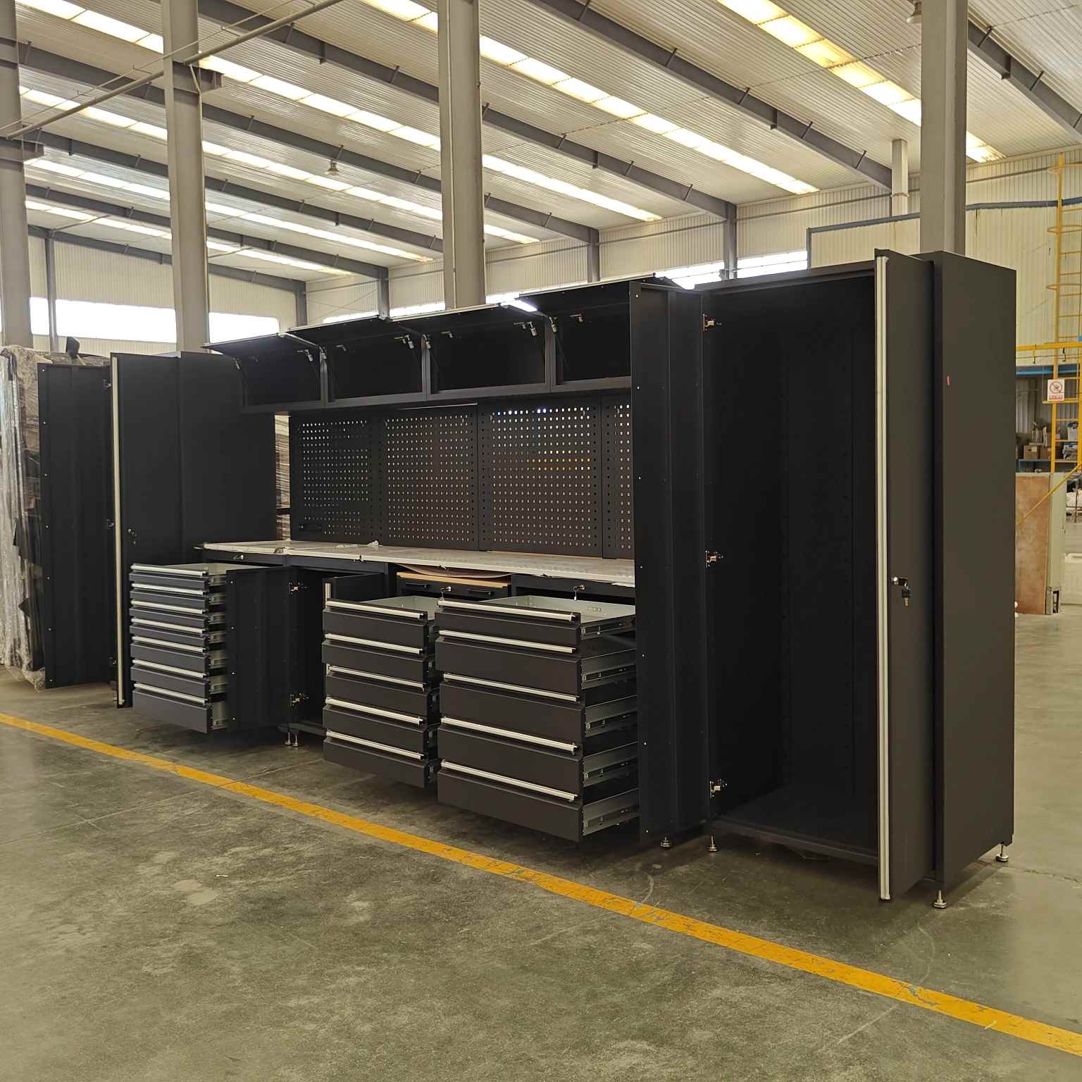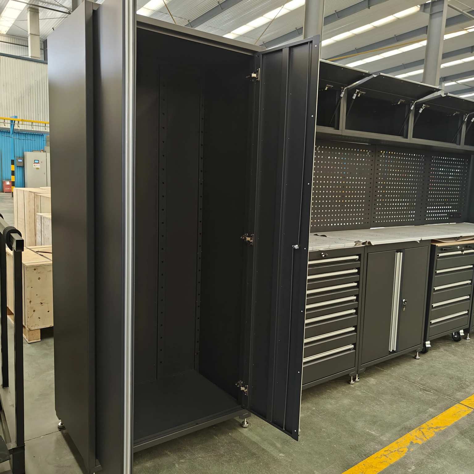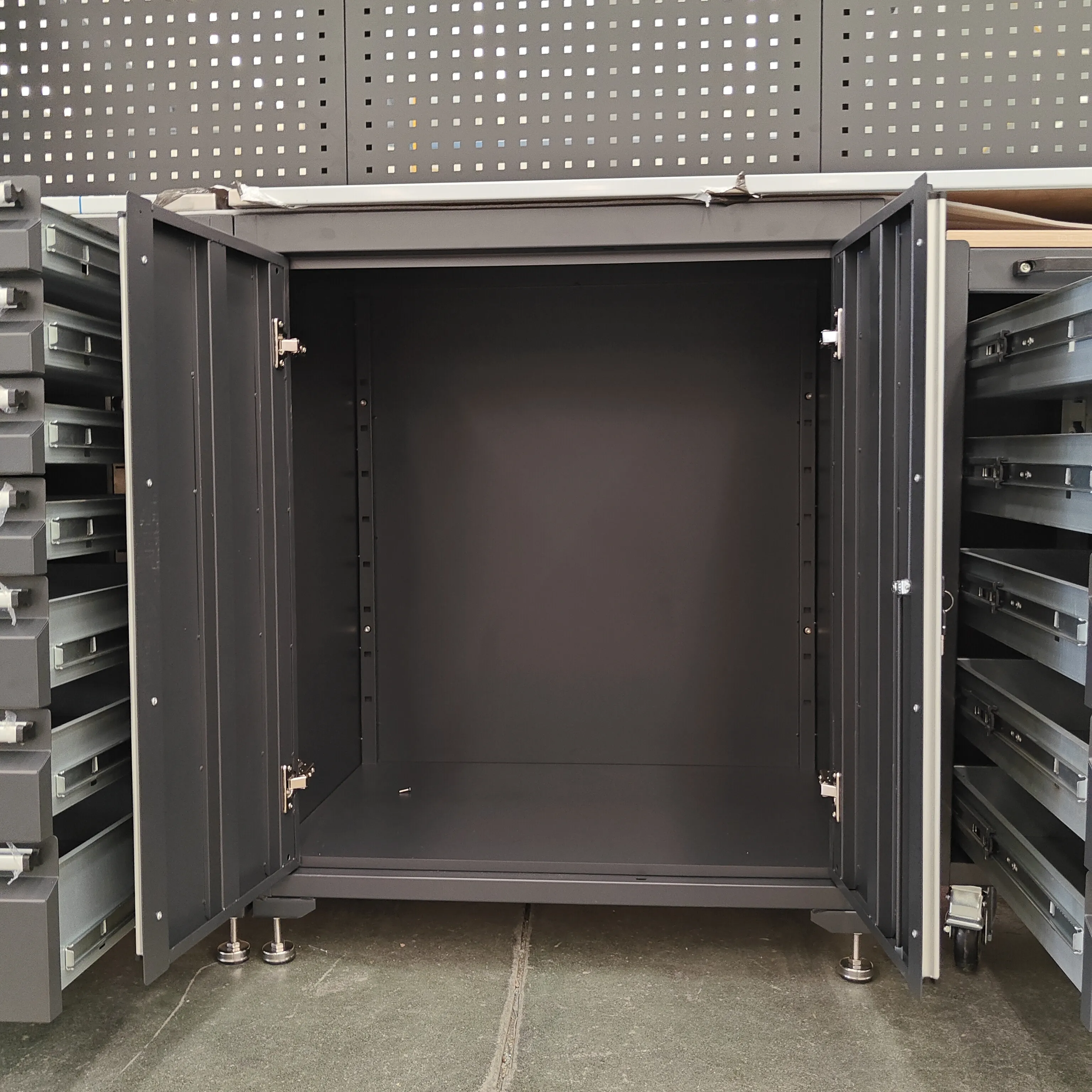 Det tunga verktygsskåpet har flera lådor, med en öppen hyllkonstruktion för varje låda, lämplig för olika storlekar.