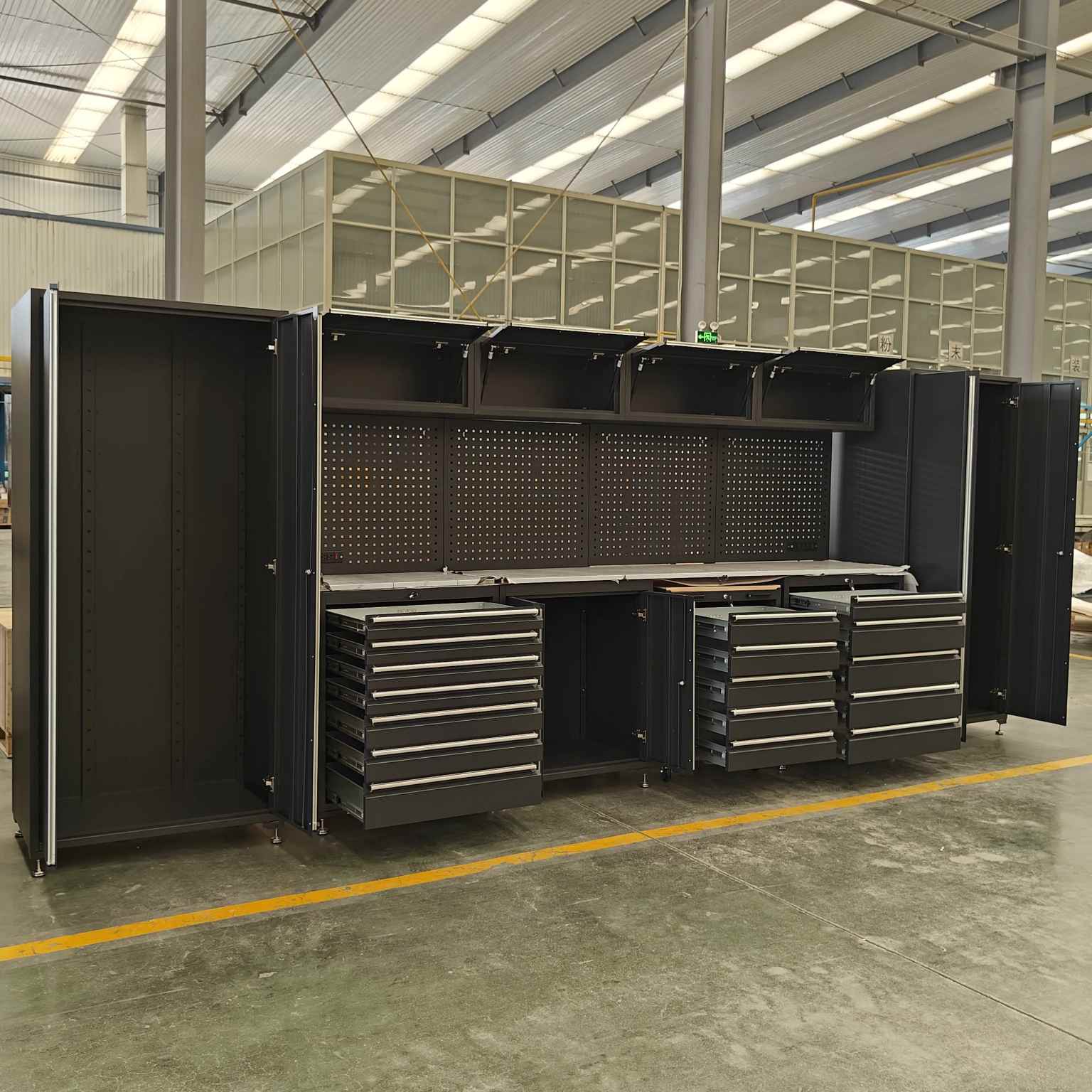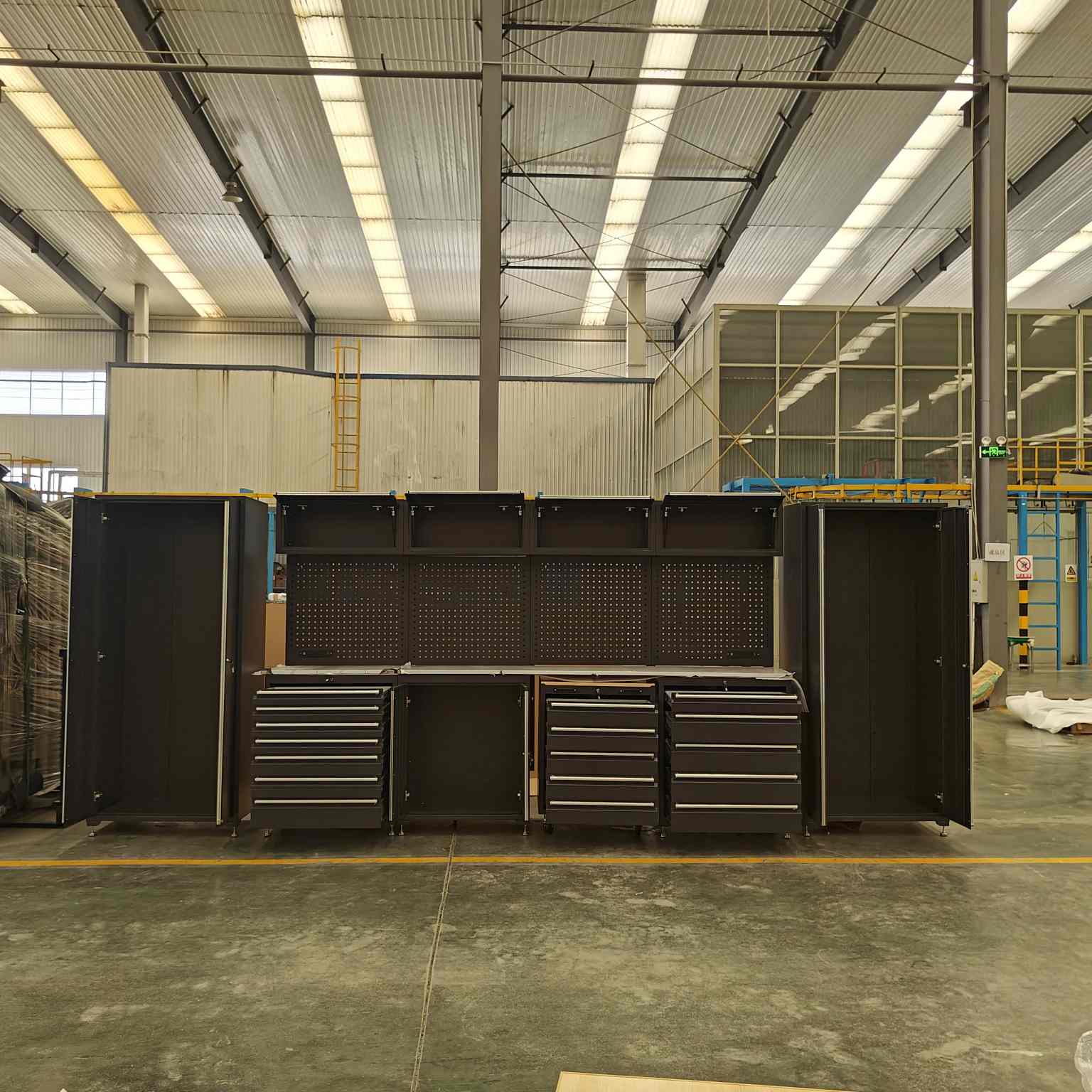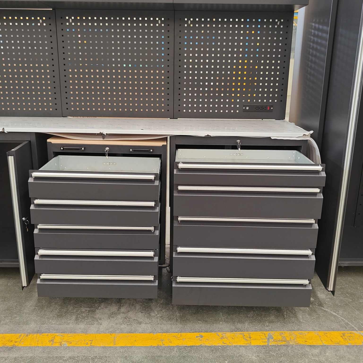 Det tunga verktygsskåpet har flera lådor, med en öppen hyllkonstruktion för varje låda, lämplig för olika storlekar.