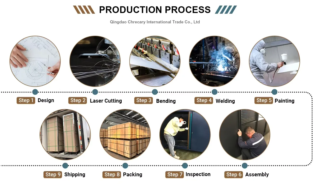 1. Råmaterialupphandling: Högkvalitativ kallrullad stålplattor väljs noggrant som huvudmaterialet för att säkerställa att den materiella styrkan och segheten uppfyller höga standarder. Samtidigt köps olika högkvalitativa hjälpmaterial, såsom kulbärande objektglas för lådor, lås och hjul.